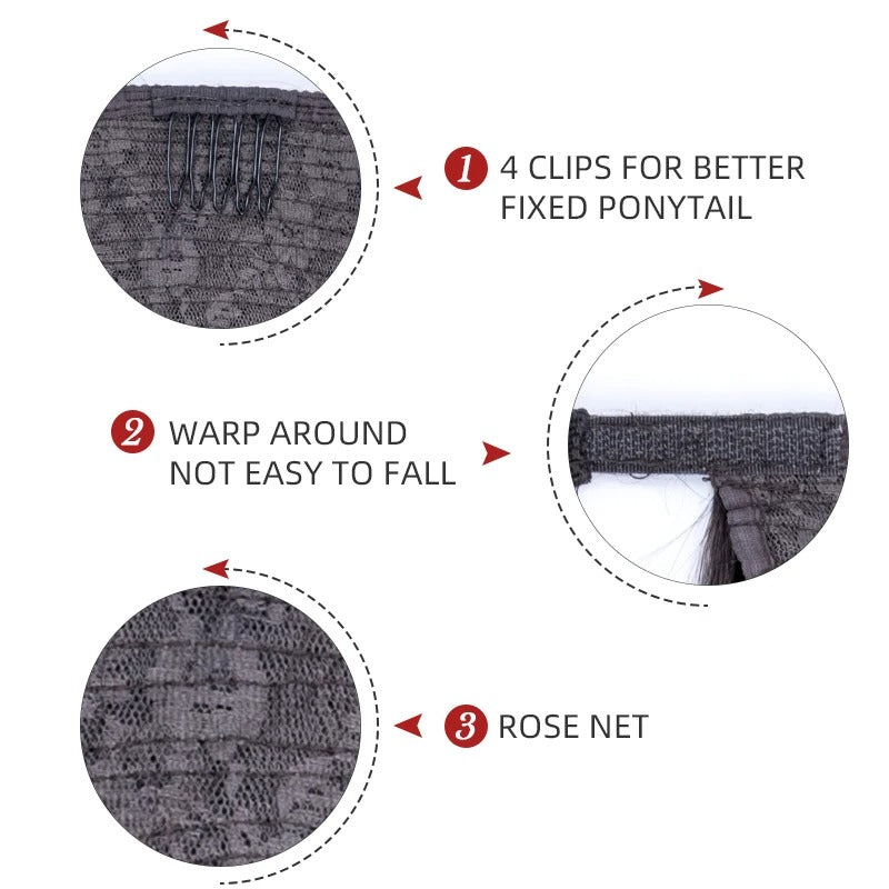Ova ekstenzija za kosu omogućava ti da u nekoliko sekundi dobiješ gust i dugačak rep, bez odlaska frizeru. Jednostavno se pričvršćuje pomoću čička i malih češljića, sigurno stoji tokom cijelog dana i izgleda potpuno prirodno.
